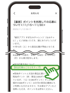 ❷お知らせ内の「【景品応募はこちらをタップ】」をタップ