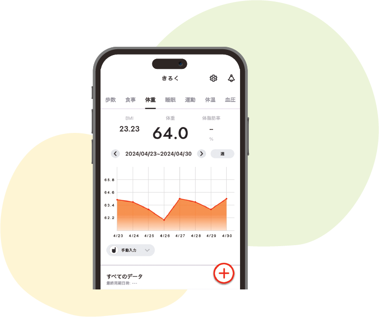 歩数や食事、運動、体重、睡眠、血圧、体温等の情報を