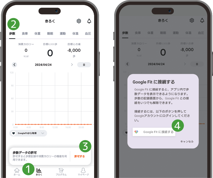 ❹ポップアップ画面から「Google Fitに接続する」をタップ
